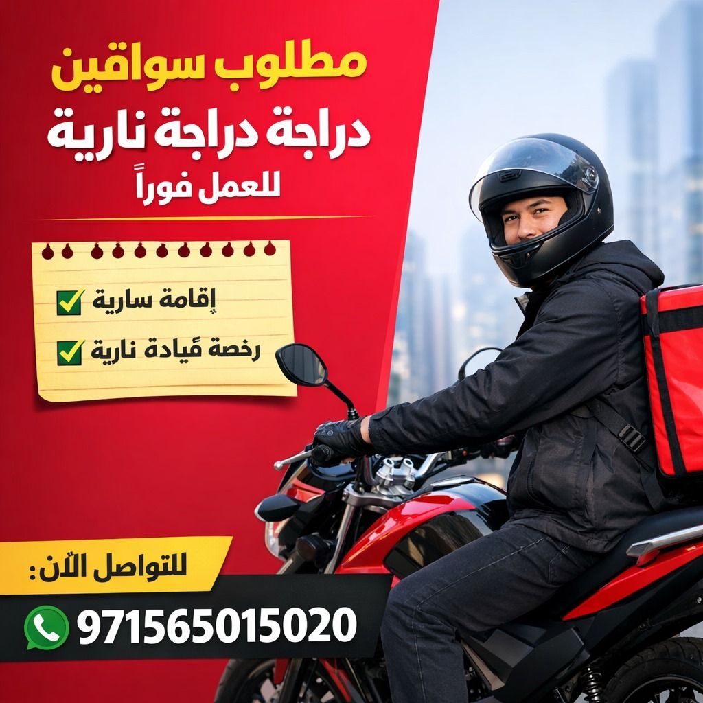 مطلوب سائقين دراجة نارية للعمل فورا لدى شركة توصيل طلبات مقرها في ديرة دبي الشروط خبرة في قيادة الدراجة النارية الالتزام بالمواعيد معرفة جيدة بالمناطق المميزات راتب مجزي حوافز دوام ثابت