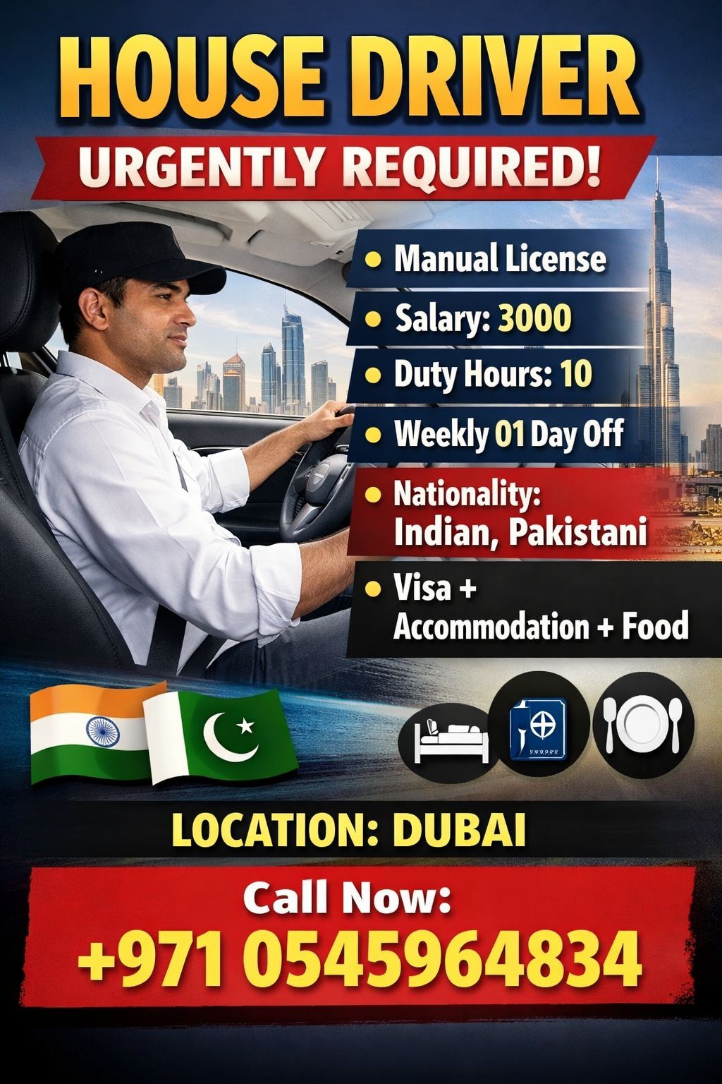 Urgently hiring for family drivers Salary package 3000 food, Accomadation, medical, Visa provided by company