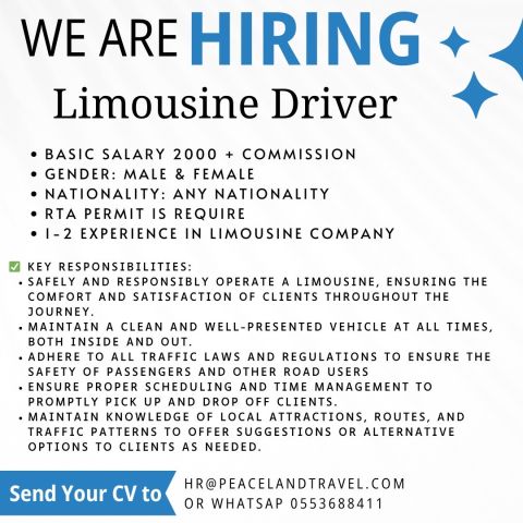 We are urgently looking for limousine driver, 1 to 2 years experience is required. Candidate should have a RTA permit Al Rigga diera Dubai