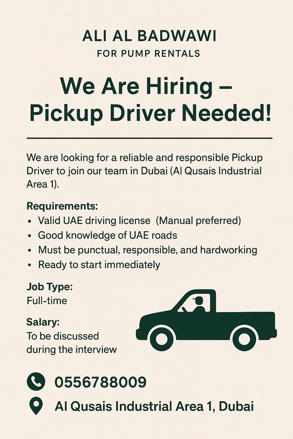 We Are Hiring - Pickup Driver Needed We are looking for a reliable and responsible Pickup Driver to join our team in Dubai (Al Qusais Industrial Area 1) Requirements Valid UAE driving license (Manual preferred) Good knowledge of UAE roads - Must be punctual, responsible, and hardworking - Ready to start immediately Job Type full time Salary To be discussed during the interview