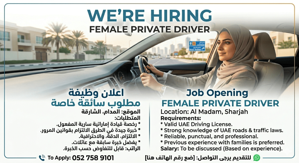 We are seeking an experienced female driver for a family in Al Ajman musherif. The candidate must have a valid UAE license and excellent knowledge of roads and traffic laws. She should be reliable, punctual, and fully committed to safe driving. Salary will be determined based on previous experience and skills