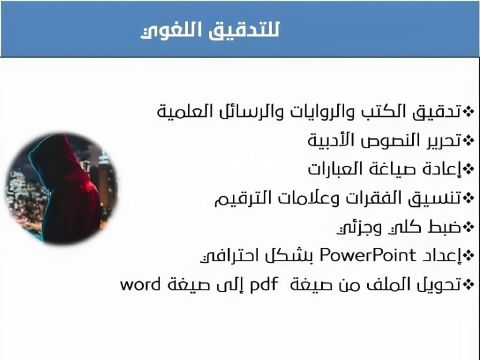 أنا مدقق لغوي أقدم خدمات المراجعة والتدقيق للنصوص العربية بدقة عالية مع تصحيح الأخطاء النحوية والإملائية، وتحسين الأسلوب والصياغة لتصبح النصوص أكثر قوة واحترافية، جاهز لمراجعة أي نصف في أسرع وقت ممكن وبسعر مناسب
