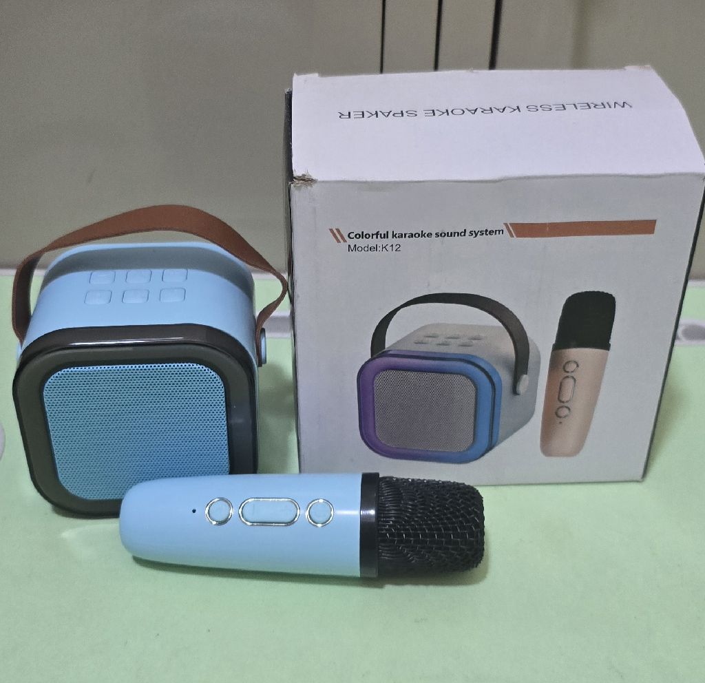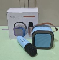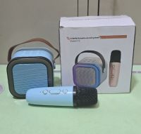 Mini karaoke speaker with wireless microphone. Premium sound quality Control light effect atmosphere Omnidirectional shock sound effect Upgraded large battery lasting Compact mini design easy carrying