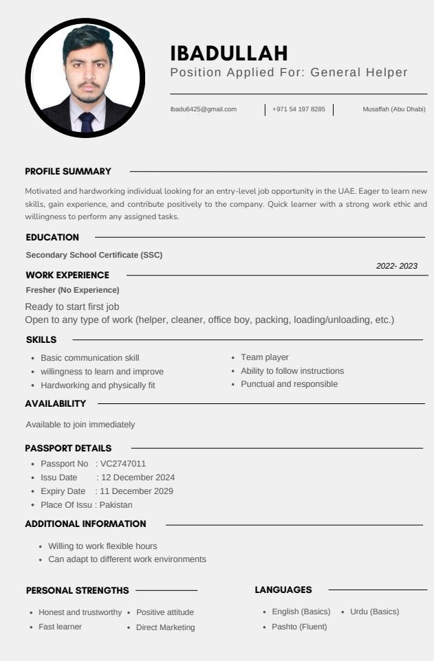اسمي عباد الله، وأنا من باكستان وأقيم حاليا في الامارات العربية المتحدة. ابحث عن وظيفة عامل مساعد عام. أنا مجتهد، أمين، ومستعد للقيام بأي نوع من العمل. متاح للانضمام فورا. اذا كانت لديكم أي فرصة أو توصية، فسأكون ممتنا جدا لدعمكم
