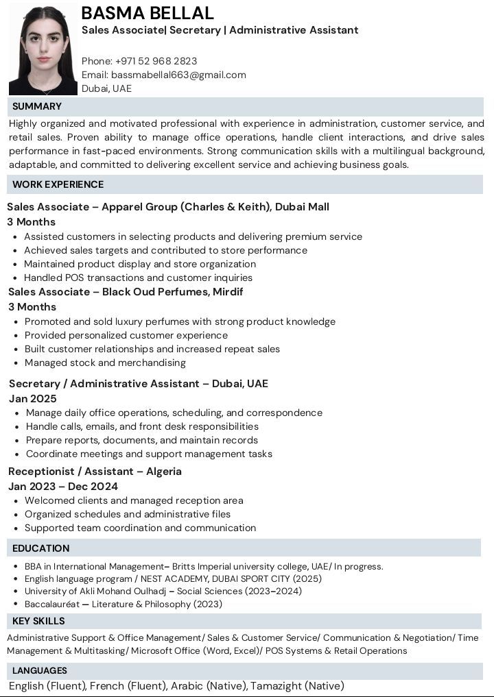 مساعدة ادارية - متاحة فورا منظمة، متعددة اللغات (عربي / انجليزي / فرنسي) خبرة في المكاتب والاتصالات. دبي