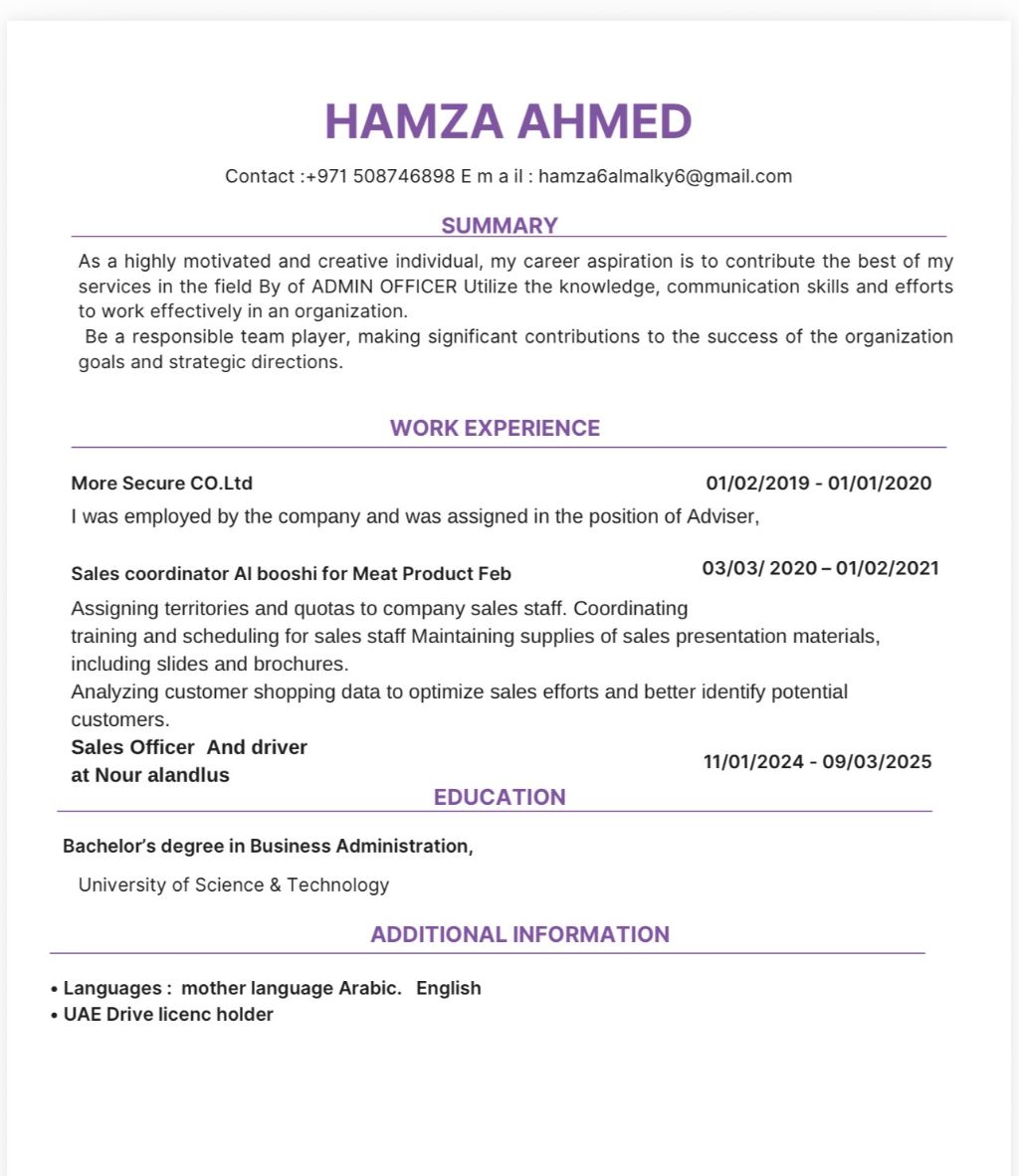 I am Hamza Mahmoud, I have a degree in business administration, with an Emirati driving license, and I am looking for a job as an external sales representative or supervisor with practical experience in developing relationships with customers, achieving sales goals, and increasing the volume of sales in thoughtful and strategic ways. Experiences and skills in dealing with clients and effective negotiation