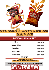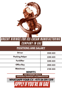 Join Our Team we are a leading Chips and Ice Cream manufacturing company based in Al Quoz Industrial Area, Dubai, and we’ re hiring Packing Staff - Responsible for packaging products - Ensuring products are properly labelled and sealed - Manufacturing a clean and organized workspace - No experience necessary, training provided Driver (with valid UAE license) Deliver products to customers - Maintain