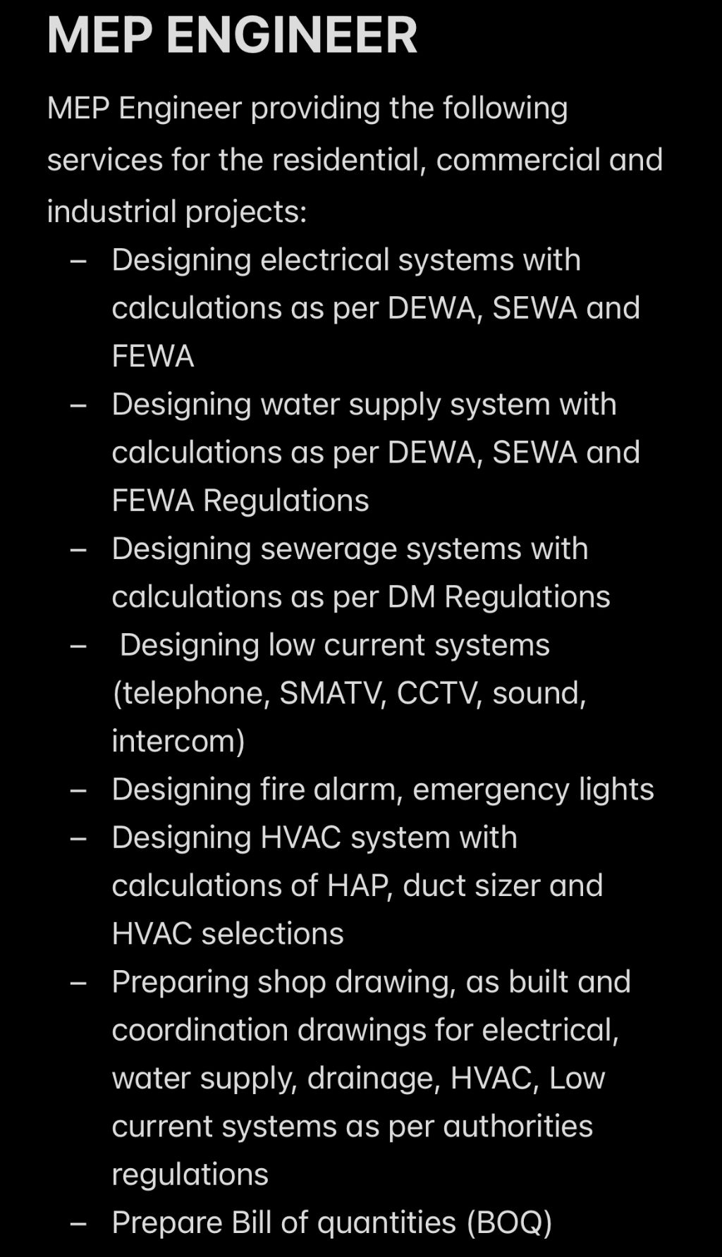 MEP Engineer providing the following services for the residential, commercial and Industrial projects Designing electrical systems with calculations as per DEWA, SEWA and FEWA - Designing water supply system with calculations as per DEWA, SEWA and FEWA Regulations - Designing sewerage systems with calculations as per DM Regulations - Designing low current systems (telephone, SMATV, CCTV, sound