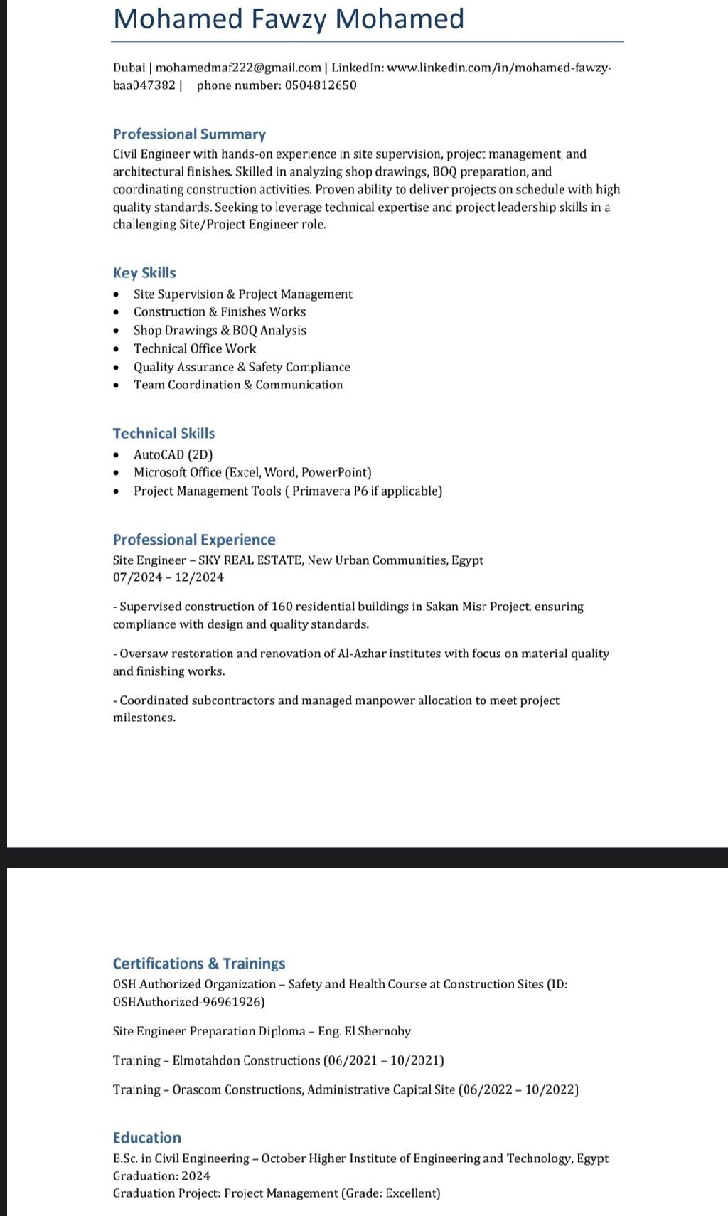 أنا مهندس مدني (حديث تخرج) متواجد في الامارات ابحث عن فرصة عمل - خبرة في التنفيذ والتشطيبات - أجيد AutoCAD وبرامج أل Office. مستعد للانضمام فورا للتواصل