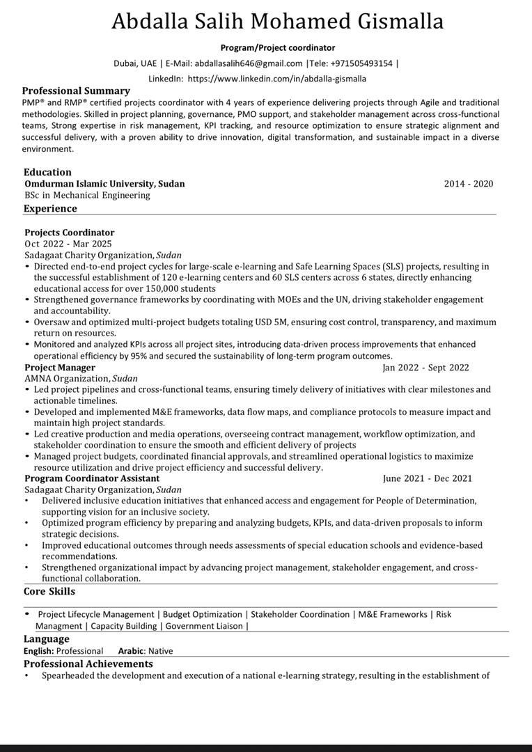منسق مشاريع معتمد (PMP ® RMP) بخبرة 4 سنوات في إدارة المشاريع المعقدة عبر مختلف القطاعات. نجحت في قيادة العديد من المشاريع والبرامج، امتلك خبرة مثبتة في إدارة الميزانيات، والتنسيق مع أصحاب المصلحة، وتطبيق أطر الحوكمة. ابحث عن فرصة عمل لتطبيق خبراتي في بيئة مليئة بالتحديات. للتواصل البريد الألكتروني