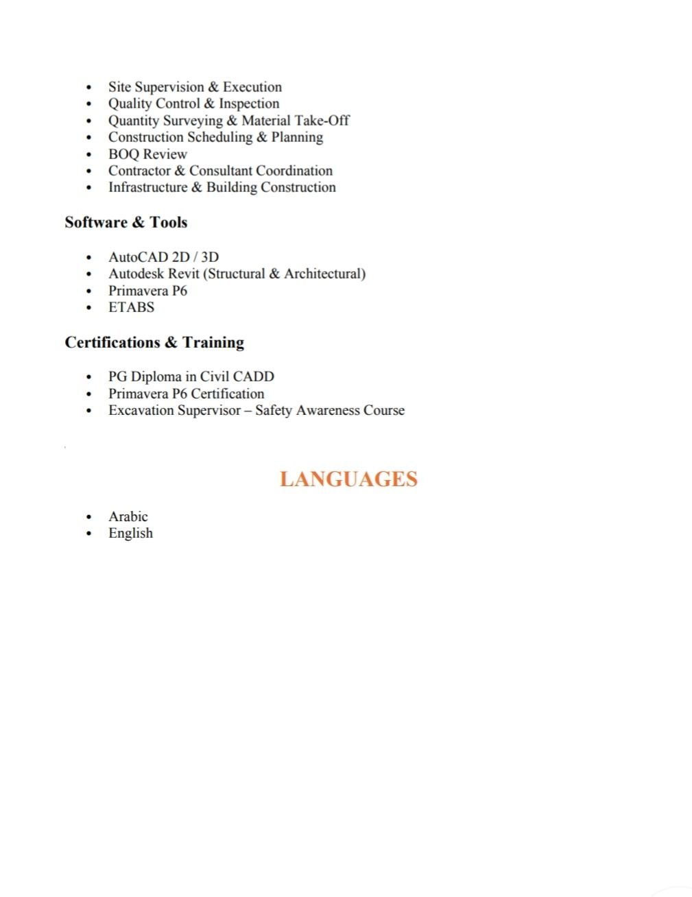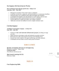 مهندس موقع مدني بخبرة خمس سنوات في الاشراف على مشاريع البناء السكنية والتجارية والبنية التحتية في دبي والعين. يتمتع بخبرة واسعة في الاشراف على المواقع، ومراقبة الجودة، وتنسيق المشاريع، وجدولة أعمال البناء. لديه قدرة مثبتة على ضمان الالتزام بالرسومات والمواصفات ومعايير البناء في دولة الامارات العربية المتحدة
