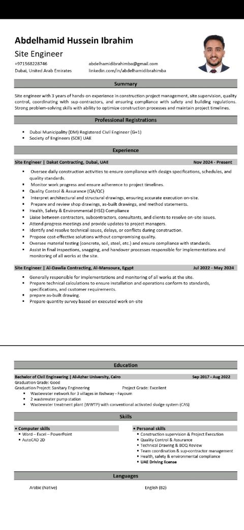 مهندس موقع أحمل رخصة بلدية دبي (DM) G 1) ورخصة قيادة لدي 3 سنوات من الخبرة العملية في إدارة مشاريع البناء والاشراف على الموقع ومراقبة الجودة والتنسيق مع المقاولين الفرعيين وضمان الامتثال للوائح السلامة والبناء. مهارات قوية في حل المشكلات مع القدرة على تحسين عمليات البناء والحفاظ على الجداول الزمنية للمشروع