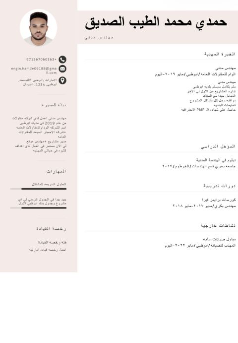 مهندس مدني خريج 24 موجود في دبي وخبرة سنة فيها مقاولات وعندي خبرة بالبرامج الهندسية من اوتوكاد ايتابس ريفيت بريما فيرا وسيف وموسوعة الورد معي ليسن وجاهز للعمل فورا ولكن عم دور ع شركة فيها استقرار موقع أو تخطيط أو تصميم ما في أي مشكلة وعندي قابلية لأتعلم شيء جديد وبصنع محتوى هندسي وفيني كون وجه اعلامي لشركتك أعرف أتعامل مع الملاك والصب كونتركتر