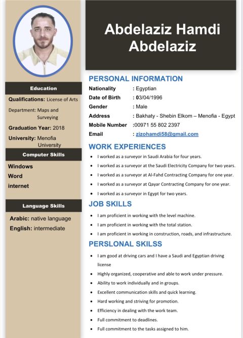 I am looking for a job opportunity in Dubai I work as a surveying specialist. I worked in the surveyor for 5 years for tow years in Egypt and three years in kingdom of Saudi Arabia. I am good at working on the LEVEL device and working on the total station device but not in a brofessional. I worked in the infrastructure. I worked in construction and worked on the roads