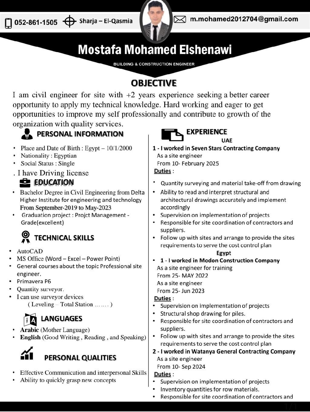 Am a Civil Engineer currently working as a Site Engineer in the UAE with 10 months of practical experience in executing and managing structural and architectural works for residential projects. Experienced in coordinating with contractors and consultants, supervising site activities, and ensuring all works are carried out according to approved drawings and specifications. Have driving license