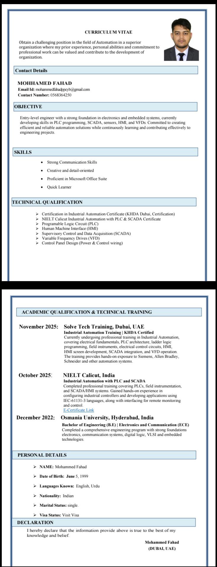 Entry - level engineer specializing in automation and control systems, with a strong foundation in electronics, embedded systems, and communication engineering. Currently expanding my expertise in PLC programming, SCADA systems, sensors, and IoT - based automation