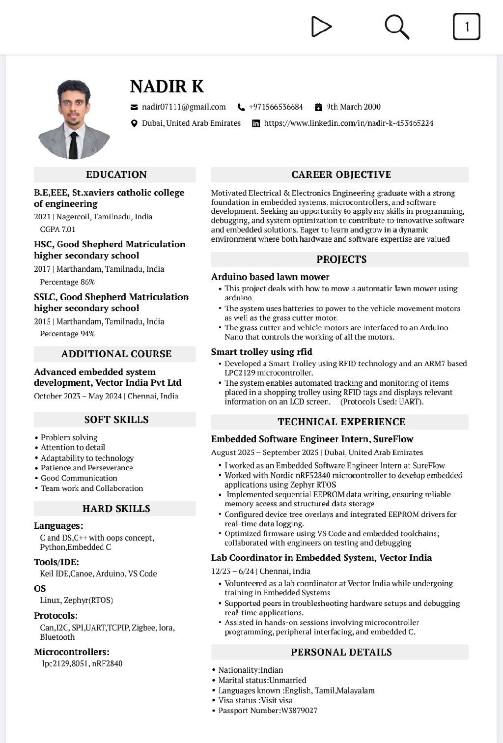 I am a Bachelor’s graduate in Electrical Engineering with hands - on experience through internships and courses in embedded systems. I have practical knowledge of automation, microcontrollers, programming, and I am eager to contribute and grow in a professional environment. Seeking Opportunities in Electrical, Electronics, Embedded or Automation Roles. Willingness to learn new tools and technologies