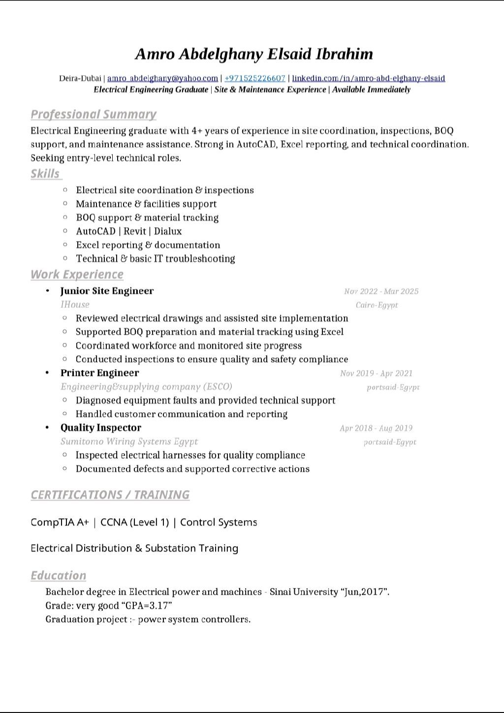 Electrical Engineering graduate with 4 + years of experience in site coordination, inspections, BOQ support, and maintenance assistance. Strong in AutoCAD, Excel reporting, and technical coordination. Seeking entry - level technical roles. Data Entry Clerk Document Controller Inventory Assistant QC Assistant Back - Office Admin