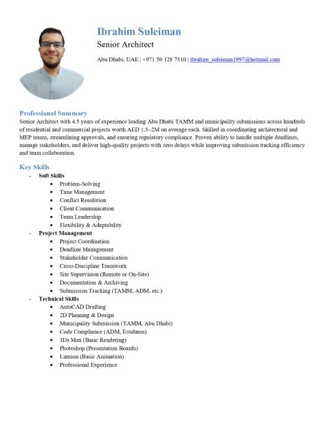Senior Architect with 4.5 years of experience leading Abu Dhabi TAMM and municipality submissions across hundreds of residential and commercial projects worth AED1.5 - 2M on average each. Skilled in coordinating architectural and MEP teams, streamlining approvals, and ensuring regulatory compliance. Proven ability to handle multiple deadlines, manage stakeholders, and deliver high - quality