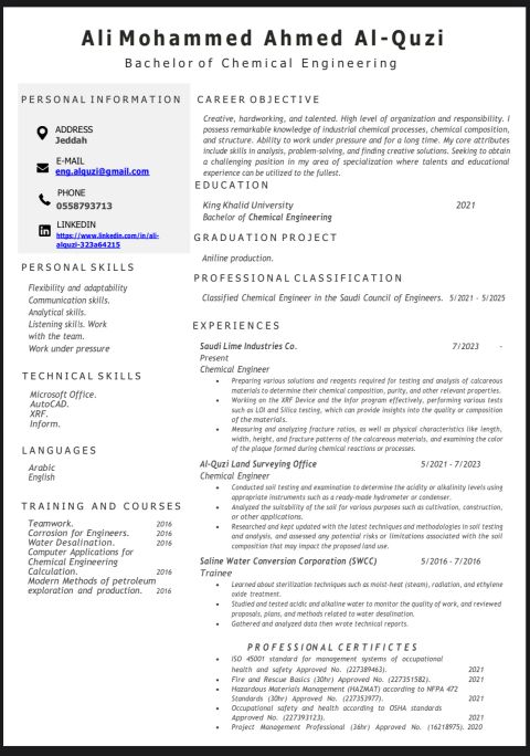 أنا مهندس كيميائي معتمد حاصل على بكالوريوس في الهندسة الكيميائية، مصنف من هيئة المهندسين. لدي عدة دورات في الأمن والسلامة ومعايير الأيزو. امتلك خبرة تزيد عن 3 سنوات في ضمان الجودة / مراقبة الجودة والمختبرات. أنا جاد في العمل وأرغب في وظيفة براتب جيد في مدينة جدة أو أي مدينة في المملكة العربية السعودية. اتمنى من لديه عرض وظيفي أن يتواصل معي
