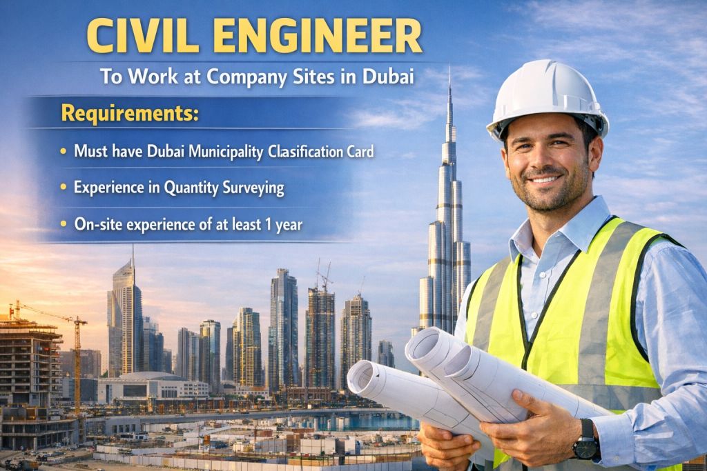 مطلوب مهندس مدني (موقع) مصنف بلدية دبي G 1 للعمل بمواقع الشركة في دبي - ابو هيل ويشترط (خبرة في حصر الكميات وخبرة في الامارات لا تقل عن سنة) من يتوفر فيه الشروط يرجى ارسال أل CV علي الايميل
