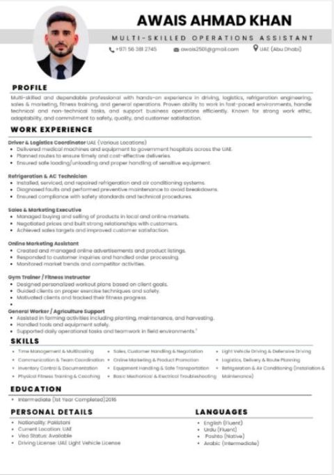 محاسب ذو خبرة 5 سنوات يبحث عن فرصة عمل في الامارات محاسب متخصص في الإدارة المالية والعمليات البنكية بخبرة عملية في اعداد التقارير المالية، إدارة الحسابات، والعمليات المصرفية. خبرة قوية في اعداد القوائم المالية والتقارير الحسابات العامة والقيود اليومية الرواتب والضرائب وVAT العمليات البنكية وخدمة العملاء إدارة النقد والمعاملات المالية بدقة مهارات احترافية Excel & Microsoft Office Quickbooks, Oracle