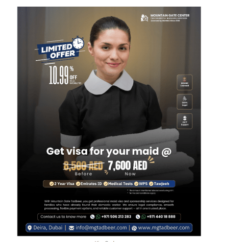 عرض خاص لدينا عرض فيزا خدمات منزلية لمدة سنتين نحن مركز مونتن جيت موجودين في ديرة دبي اجراءات سريعة وقانونية سعر مناسب ومنافس متابعة كاملة حتى الاستلام متابعة كاملة للاجراءات متاح لبعض الجنسيات الدولة الامارات العربية المتحدة للاستفسار والتفاصيل يرجى التواصل