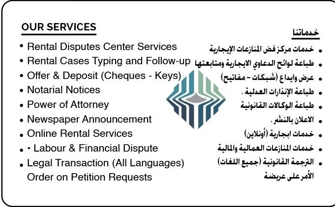 هل لديك مشكلة أيجارية وتحتاج لحل سريع خبرة في تقليص وانهاء المعاملات الخاصة بالمنازعات الأيجارية للشقق تقديم استشارات واضحة وسريعة باللغة العربية والانجليزية ترجمة القوانين والعقود القانونية بدقة واحترافية مساعدتك في الوصول الى أفضل الحلول القانونية بأقل جهد وتكاليف سواء كنت مستأجرا أو مالكا، الحل عندي بخبرة قانونية موثوقة. تواصل الآن مباشرة عبر