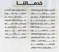 توفير خدمات تخليص المعاملات تأسيس الشركات توفير وكيل خدمات الطباعة والمرور ودائرة التنمية الاقتصادية والضمان الصحي كافة المعاملات الحكومية والترجمة القانونية خدمة مندوب علاقات عامة لكافة المعاملات مناديب خبرة وكفاءة طويلة تعاقد شهرية تبدأ من 750 درهم للشركات