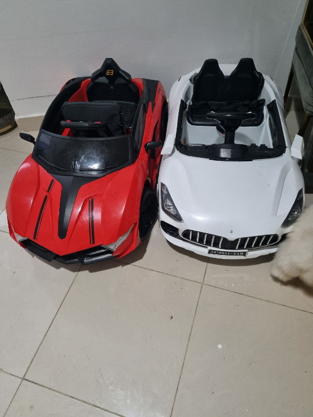 عرض بيع سيارة اطفال تمشي بالكهرباء بجهاز تحكم في منهم اثنين باللون الأبيض والأحمر في حالة جيدة لمن يهتم التفاصيل عل الرقم