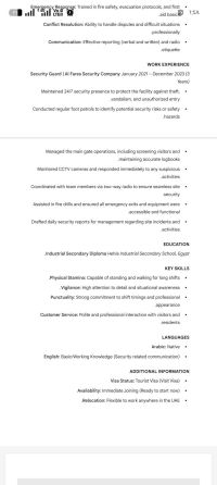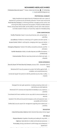 Professional Security Guard with 3 Years Dubai Experience Summary Highly disciplined Security Professional with a proven track record at Al Fares Security Company in Dubai (2021 - 2023) Experienced in protecting facilities, managing access control, and ensuring the safety of property and personnel. Core Skills Surveillance Proficient in monitoring CCTV systems and alarm panels. Access Control
