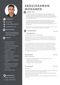 الاسم عبدالرحمن محمد السن 28 سنة الجنسية مصري الطول / 190 سم، الوزن / 90 كجيم، ابحث عن فرصة عمل مناسبة، أتمتع بالجدية والانضباط والقدرة على تحمل ضغط العمل، والالتزام بالتعليمات والعمل بروح الفريق