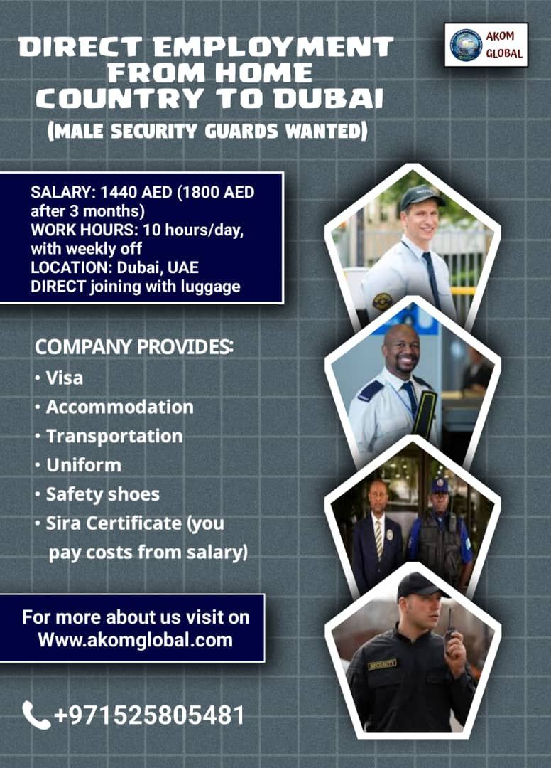 DIRECT EMPLOYMENT From HOME Country TO Dubai Emirate UAE Security Company NEEDS BOYS Security Guard Without SIRA Certificate Company will provide SIRA Certificate But you pay costs of SIRA Certificate From your salary from, AED1440 after 3 months Salary, AED1800 10 hours of work Weekly off Visa Accommodation Transportation and uniform Aafety shoess provides by the