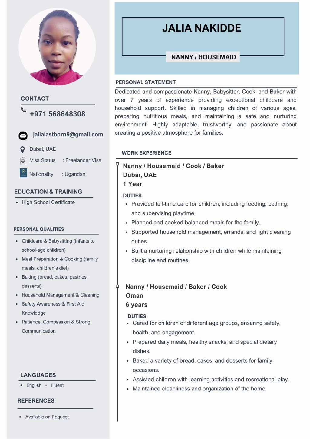 I am looking for a job as a Housemaid, Babysitter, or Cook in the UAE. My name is Jalia, dedicated and compassionate individual with over 7 years of experience working in both Oman and Dubai. I specialize in childcare, household management, and meal preparation, including baking bread, cakes, and desserts. I Prefer LIVE OUT BASIS, I have Own Visa AS WELL I have provided care for children of all ages