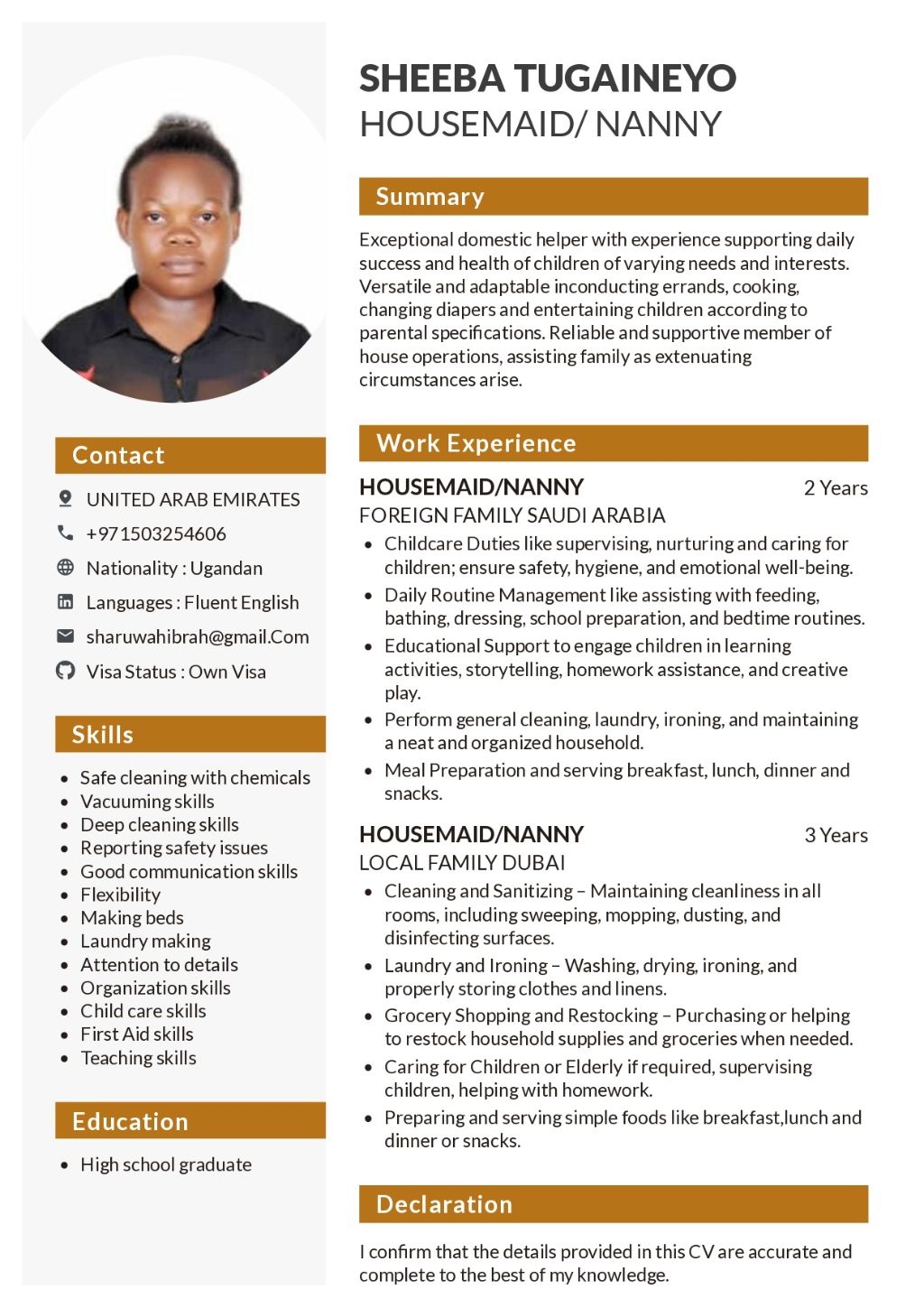 I am looking for a job as a Nanny, Housemaid, or Cook in the UAE. I have 5 years of experience in the Gulf, working with both local and foreign families, and I hold my own valid UAE visa. I am fluent in English and able to provide professional, reliable, and caring support in any household. I am open to Live in or Live Out Basis. I have extensive experience in childcare, including supervising, feeding