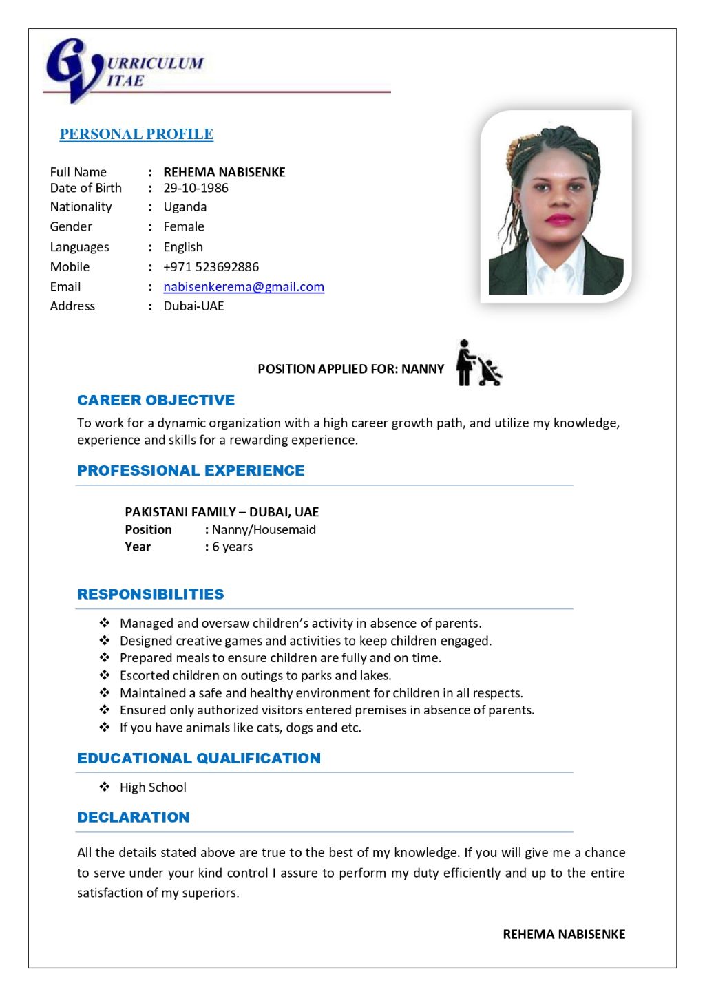 I am looking for a job as a Nanny/ Housemaid, I have own Visa as well. My name is Rehema, dedicated and caring nanny with over six years of experience working with a Pakistani family in Dubai. I am passionate about creating a safe, clean, and nurturing environment for children. I am fluent in English and committed to supporting families with trust, professionalism, and warmth. Throughout my experience