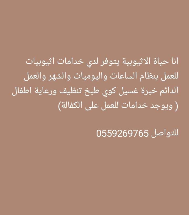 أنا أم ريان الاثيوبية يتوفر لدي عاملات أثيوبيات مقيمات وغير مقيمات يتكلمن اللغة العربية والانجليزية، لديهم الخبرة في الغسيل والكوي والعناية بصغار السن ويوجد طبخات شاطرات خبرة في جميع الطبخات والصالونات والاكلات الاماراتية بنات أمينات وشاطرات
