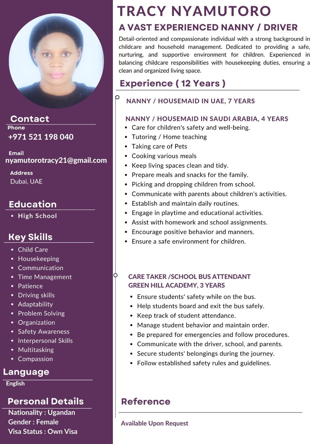 I am looking for a job a Driver/ Nanny/ Housemaid in a Family or school where I can utilize my excellent skills and gulf experience of 12 Years in Child care, cleaning, teaching and other duties. Seven years of UAE Experience in a European Family in The Palm Jumeirah, Dubai, UAE plus other three years in other families in UAE I have years of Saudi Arabia experience as a Nanny/ Housemaid and 3 years of