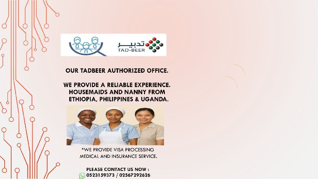 مكتب تدبير مرخص ومعتمد نوفر لكم عاملات منزليات مقيمات مدربات وموثوقات من اثيوبيا - أوغندا - الفلبين - العاملات منزيات مدربات على التنظيف - الكي - الغسيل الطبخ (حسب الجنسية) رعاية الاطفال والرضع مساعدة الاطفال في الدراسة دعم كبار السن