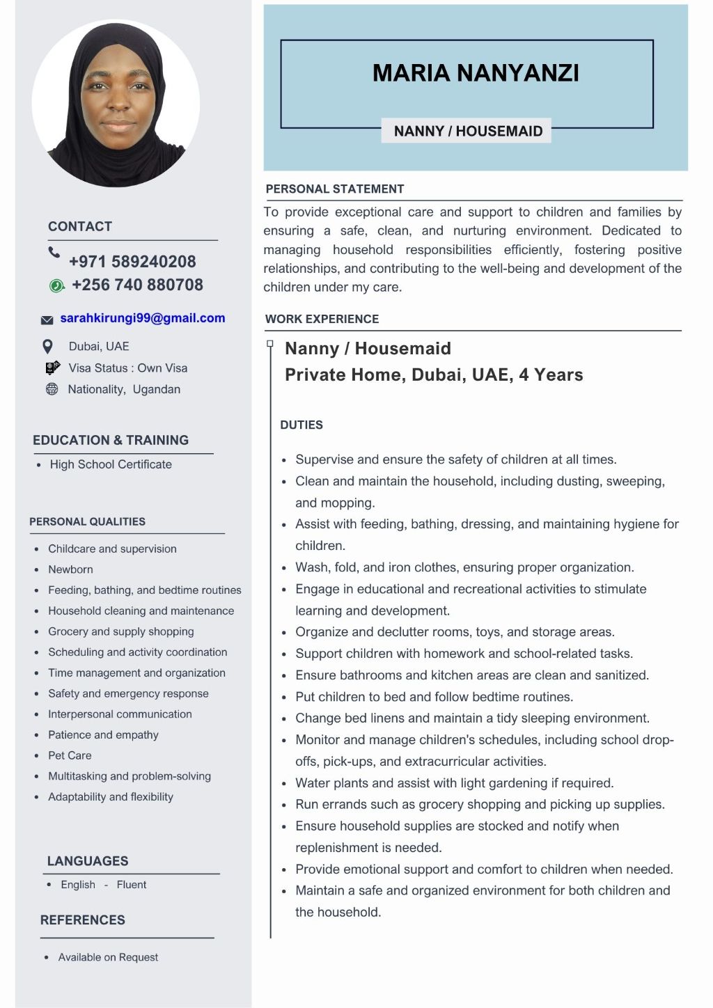 My name is Maria, and I am currently looking for a job as a Live Out Nanny or Housemaid in Dubai. With hands - on experience in childcare, household management, and Pet care, I am confident in my ability to provide a safe, clean, and supportive environment for families. I am currently on Own visa, prefer a live - out position, and am available to start immediately. I have experience caring for children