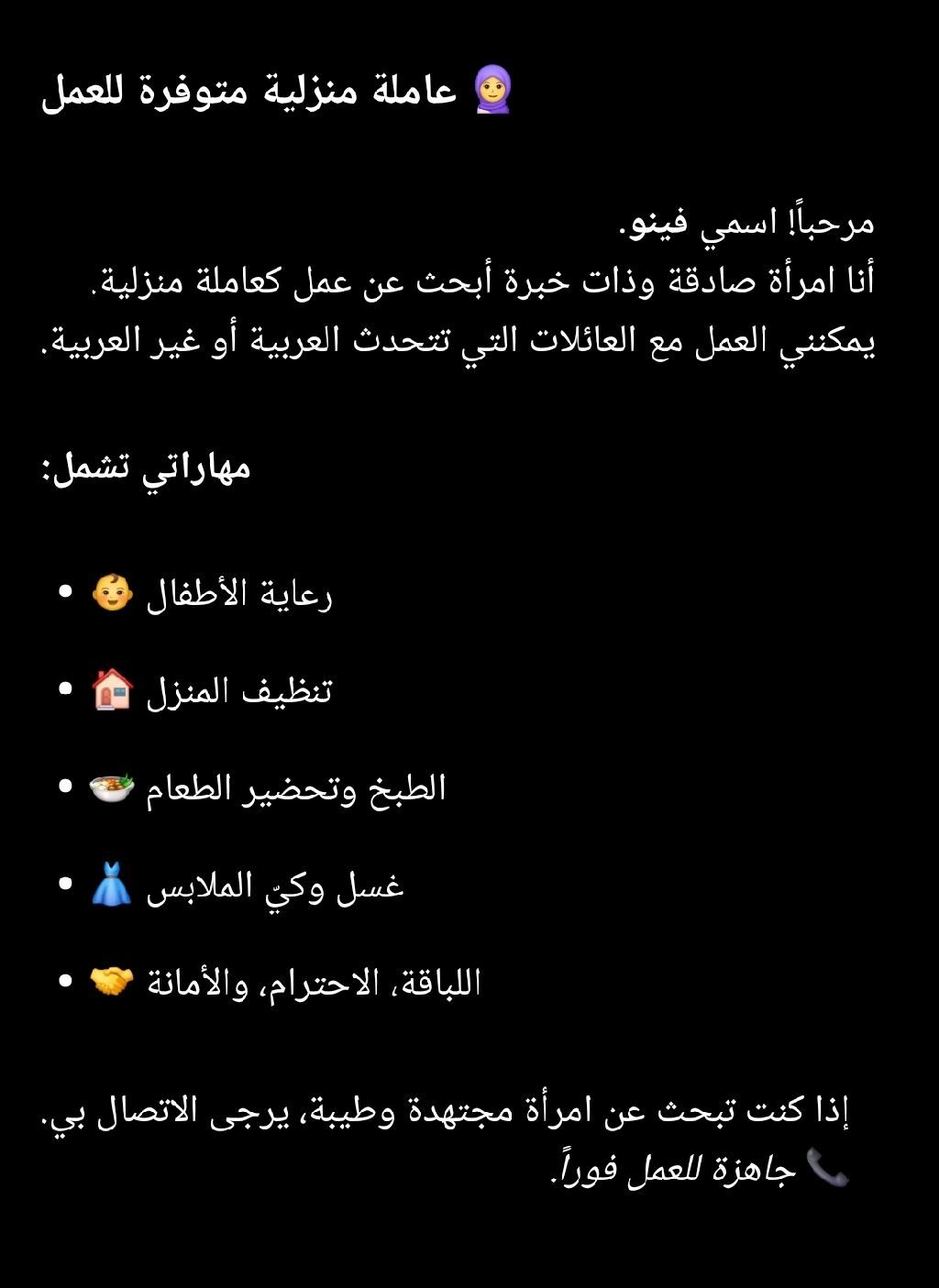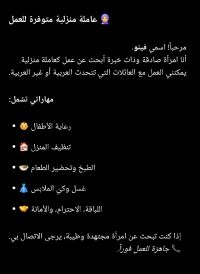 Hello, how are you my name is fenu. Among the people who are looking female domestic workers (housemaids) please read my message. I have experience both with those who speak Arabic and those who do not. my responsibilities. Taking care of children. cleaning the house cooking food. washing clothes. Being kind, friendly, and respectful, etc