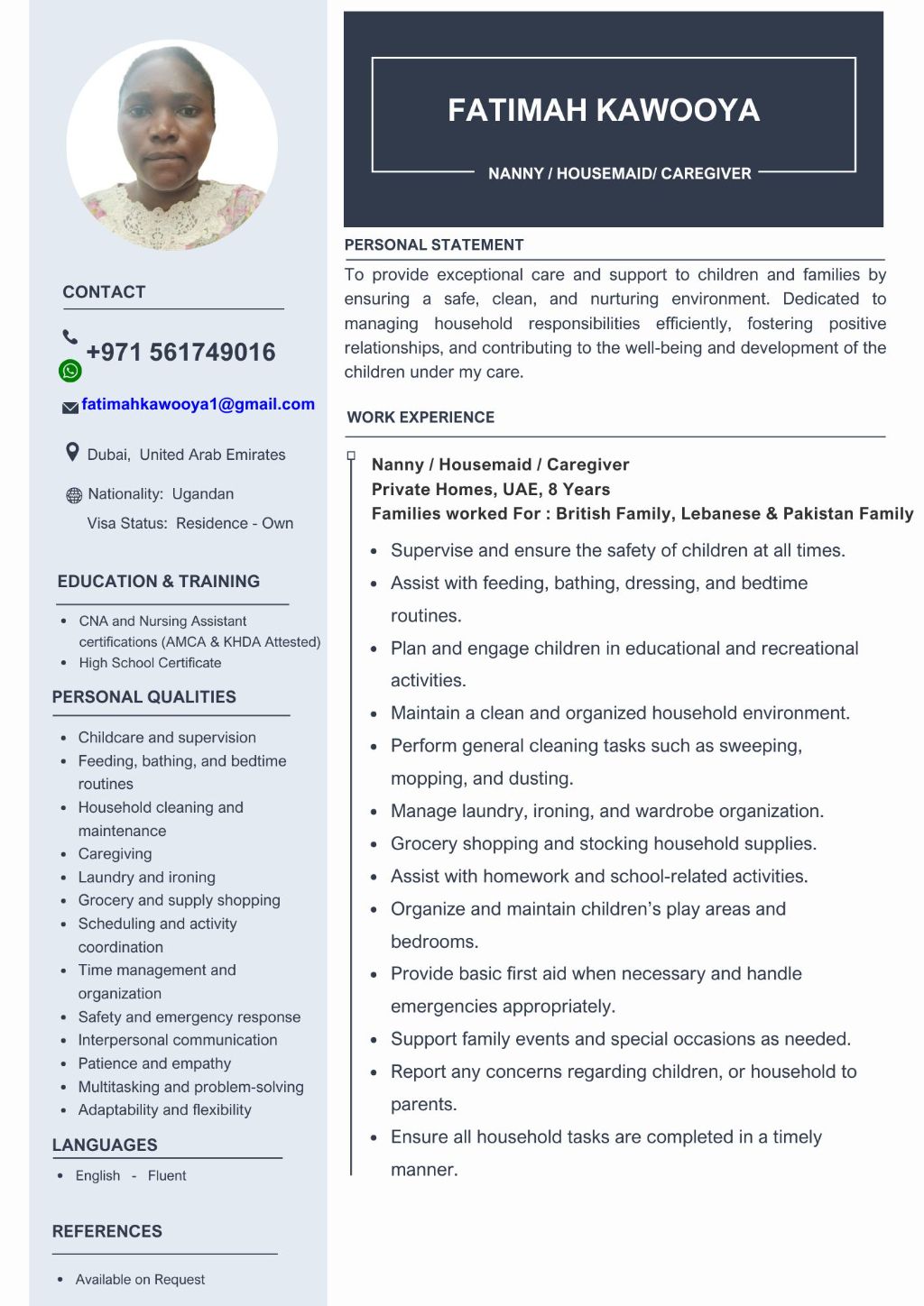 I am looking for a job as a Nanny or Caregiver in Dubai. My name is Fatimah Kawooya, compassionate, patient, and dedicated professional with over 8 years of caregiving experience in the UAE and Oman. I hold CNA and Nursing Assistant certifications (AMCA & KHDA Attested) and have hands - on experience providing care to elderly individuals, disabled patients, and children. I have own Visa, I prefer Live