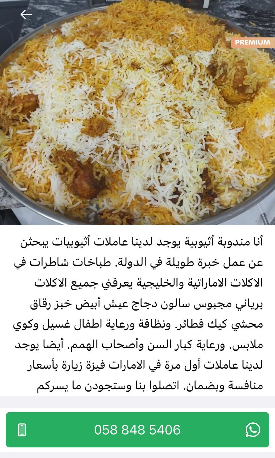 I am an Ethiopian representative. We have Ethiopian domestic workers seeking employment. They have extensive experience in the UAE and are skilled cooks specializing in Emirati and Gulf cuisine. They know all the dishes, including biryani, machboos, chicken salon, white rice, stuffed flatbread, cakes, and pastries. They also offer cleaning, childcare, laundry, ironing, and care for the elderly an