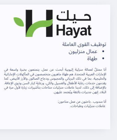 أنا حياة الاثيوبية، يتوفر لدي بنات أثيوبيات للعمل في حضانة الاطفال والتنظيف وخبرة في غسيل كوي طبخ تنظيف والاهتمام بكبار السن خبرة داخل الدولة ويوجد فترة تجربة