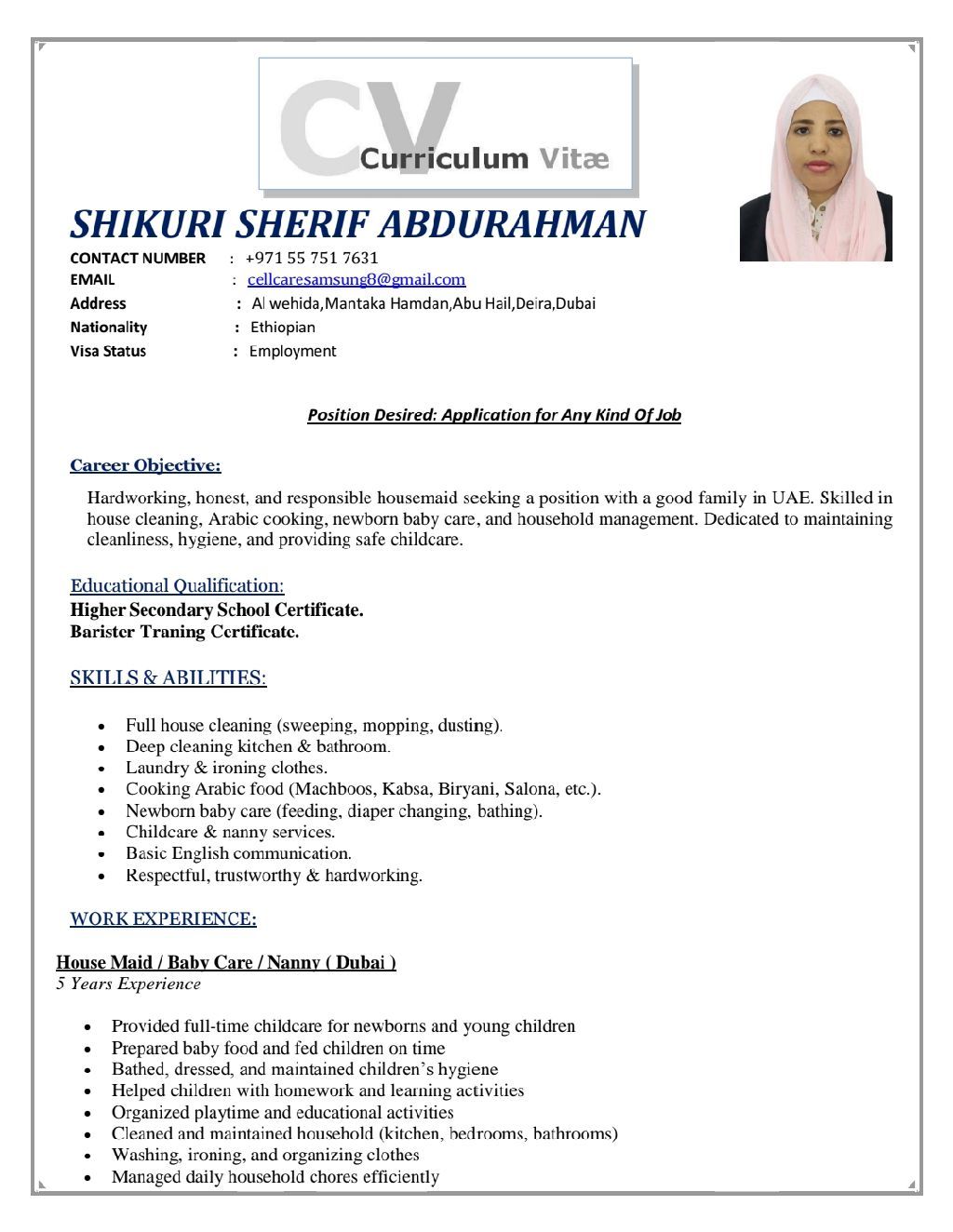 I am looking for housemaid or nanny position for a decent family in UAE. I am flexible and multilingual and able to communicate in English and Arabic