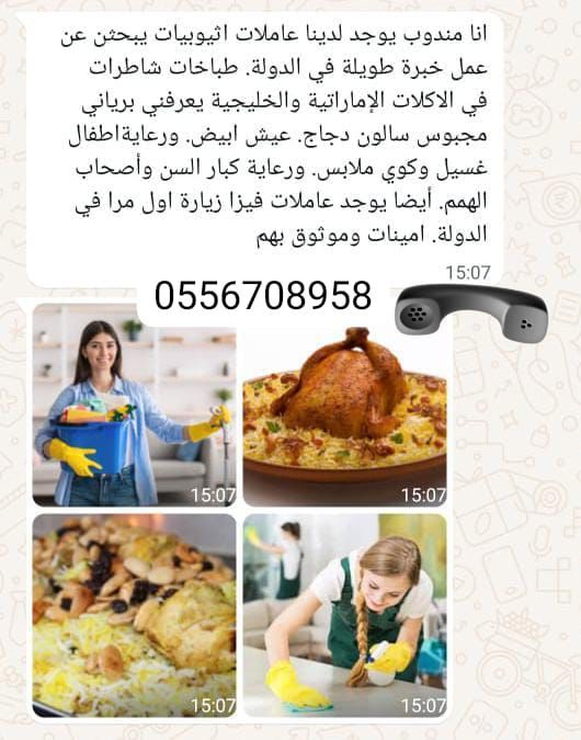 أنا مندوب يوجد لدينا عاملات أثيوبيات يبحثن عن عمل خبرة طويلة في الدولة. طباخات شاطرات في الاكلات الاماراتية والخليجية يعرفني برياني مجبوس سالون دجاج. عيش أبيض. ورعاية اطفال غسيل وكوي ملابس. ورعاية كبار السن وأصحاب الهمم. أيضا يوجد عاملات فيزا زيارة أول مرا في الدولة. أمينات وموثوق بهم
