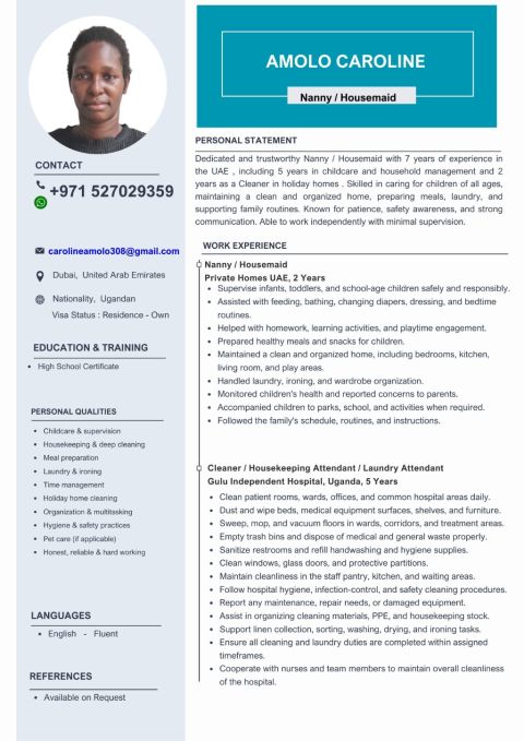 I am looking for a job as a Nanny/ Housemaid/ Cleaner, I have own Visa as well. My name is Amolo, and I am currently looking for a position as a Nanny, Housemaid, or Cleaner in Dubai. I bring 7 years of solid experience, including 5 years in childcare and home management in the UAE and 2 years of professional cleaning and laundry work in holiday homes and hospital settings. I have hands - on experience