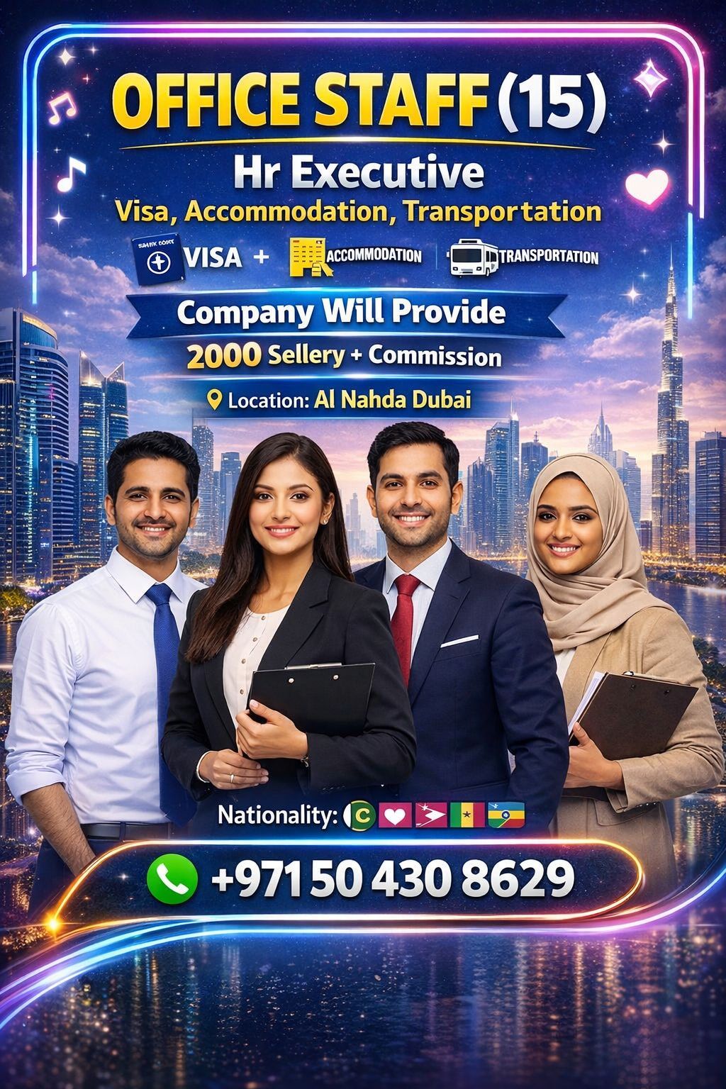 STAFF HR Executive 2000 + Commission Visa, Accommodation, Transportation Company Will Provide Location Al Nadha Dubai any visa accept send WhatsApp CV