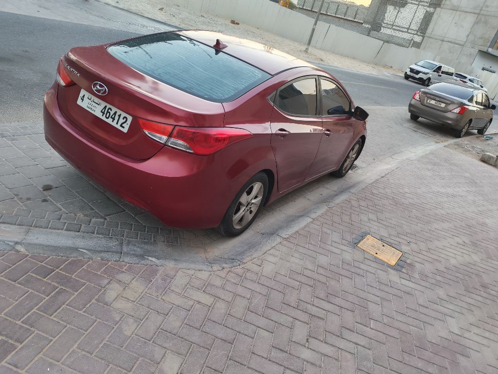 Hyundai Elantra 2013 model, personal use car, imported, burgundy color, accident-free, cruise control, eco system, aluminum rims, center console. The car has new tires and a new battery. Located in Dubai, Jumeirah Circle area.