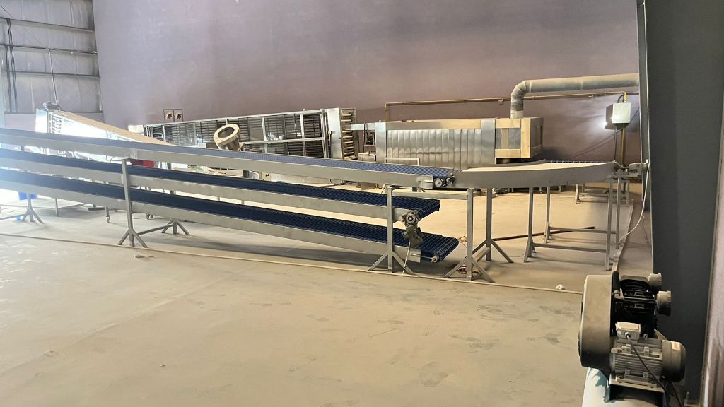 خط انتاج خبز آلي متكامل مخبز أوتوماتيكي صناعي مخبز مجهز بالكامل بجميع المعدات والتجهيزات الحديثة، مع انتاج يومي منتظم القدرة الانتاجية 6000 خبزه في الساعة يعمل على الغاز وممكن يتبدل الحراق على مادة المازوت، حالة جديدة تم تشغيله للتجريب فقط خط الانتاج صناعة تركية ماركة SamiKammaz Ovens المكونات الأساسية 1 نظام قطاعة العجين بالهواء المضغوط. غرفة التخمير الرئيسية. آلة فرد العجين. غرفة التخمير النهائية